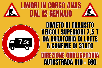 Si comunica che a partire da lunedì 12 gennaio, dalle ore 8.00, e sino al 12 maggio, la Strada Statale 1 Aurelia, direzione Balzi Rossi, dalla rotatoria di Latte al Confine di Stato di Ponte San Ludovico, sarà chiusa al transito in entrambe le direzioni per consentire l’avvio dei lavori di risanamento delle gallerie “Dogana” e “Balzi Rossi”, a cura di ANAS S.p.A.